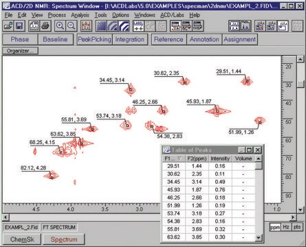 ACD/2D NMR Processor allows you to import and process the 2D spectrum for a wide variety of 2D experiments including one-bond and long-range variants of H,H COSY, C,C COSY (INADEQUATE), C,H COSY (HETCOR), as well as H,H and C,H J-resolved spectra. Tools include transparent spectrum overlay, distance measurement and auto-processing.