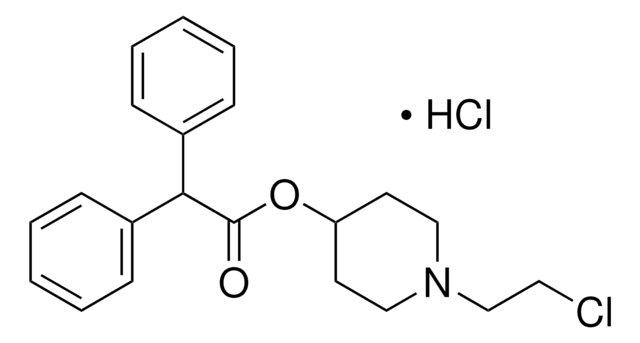 The compound 4-DAMP mustard (N-2-chloroethyl-4-piperidinyl diphenylacetate) is a 2-chloroethylamine derivative of the selective muscarinic antagonist 4-DAMP (N,N-dimethyl-4-piperidinyl diphenylacetate). At neutral pH, 4-DAMP mustard cyclizes spontaneously into an oziridinium ion that binds covalently with muscarinic receptors. Analysis of the kinetics of