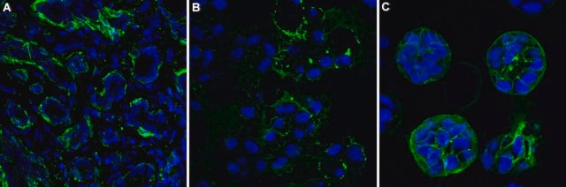 Immunofluorescence Analysis: A 1:100 dilution from a representative lot detected Actin in human breast tissue and patient-derived triple negative breast cancer organoid sections.