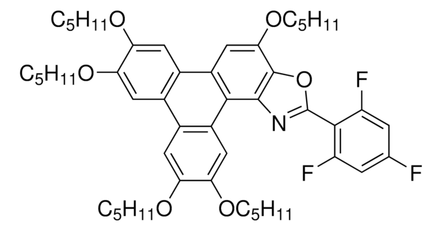 TpOx-Ph-opo-3F is UV excited fluorescent material with a polycyclic aromatic donor-acceptor structure where the triphenoxazole core acts as a donor and the aromatic group on the two position of the oxazole (2,4,6-trifluoro-phenyl) act as the acceptor group. The push-pull, donor-acceptor, structure facilitates intramolecular charge transfer in the excited state that results in a 226 nm emission Stokes Shift. TpOx-Ph-opo-3F is also a photo-conducting Discotic Liquid Crystalline (DLC) material with mesophase transition onset temperature of 105 °C. TpOx-Ph-opo-F is designed for 355 nm and 405 nm excitation with emission at 496 nm with quantum yield of 0.63, high thermal, chemical and photostability. TpOx-Ph-opo-3F has potential uses in fluorescent dye staining, organic electronic and photonics, and imaging applications.