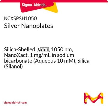 Our silver nanoplates (a.k.a. silver nanodisks) exhibit surface plasmon resonance (SPR) effect and, depending upon their diameter and thickness, possess resonance peak between 550nm t0 1050nm. The extremely high absorbing and scattering cross section of these nanoplates make them useful for surface-enhanced Raman scattering (SERS), photovoltaics, molecular detection, and photothermal cancer therapies. The presence of silica shell on silver nanoplates provides robust surface and enhances their stability in variety of solvents. The silica shell offers a versatile surface for attaching functional groups or creating hydrophobic & hydrophilic surfaces. The presence of silica shell on the surface of silver nanoplates also allows their easier deposition onto substrates and incorporation into different solvents, resins, and curable materials while protecting them from aggregation and preserving their optical properties.