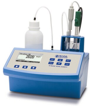 The accuracy of the instrument is ensured by performing a peristaltic pump calibration using the provided Hanna standard. The endpoint determination algorithm analyzes the pH vs. volume curve to determine the exact pH endpoint and performs the necessary calculations. The results are displayed in mg/L CaCO3or meq/L CaCO3 units on the graphic display.