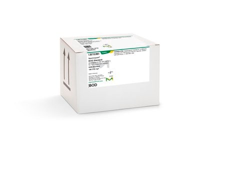 This standard solution is then analyzed using the Spectroquant® BOD Cell Test to check the procedure for the BOD measurement. The quantity of lyophilisate contained in each bottle of BOD Standard is sufficient to prepare 1 l of standard solution with 198 ± 40 mg/l BOD5 or 206 ± 40 mg/l BOD7.