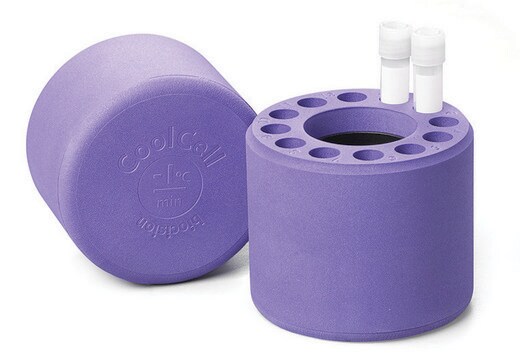 CoolCell 5ml LX alcohol-free freezing container holds 12, 3.5 mL to 5.0 mL cryogenic vials and provides a highly reproducible -1 degree C/minute freezing rate when used in a -80 degree C freezer. No alcohol or fluids required. The insulative outer housing and thermo-conductive core ensure consistent heat removal to all vials throughout the freezing period. CoolCell containers are unbreakable, open easily when frozen, and are not cold to the touch when frozen - no "frosty" fingers. Enhanced design features include beveled junction between base and lid to allow quicker opening once frozen, numbered vial wells for easy sample identification, and exposed vial tops when container is open allowing for faster removal of vials for placement onto dry ice or liquid nitrogen.