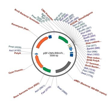 Promoter Expression Level: This plasmid contains the mammalian CMV promoter to drive gene expression. We have tested all of our mammalian promoters in a range of cell types and CMV is consistently the strongest in those we have studied. However there are many reports of the CMV promoter demonstrating silencing by methylation in long-term culture. The RSV promoter driving reporter gene expression is one of the weakest mammalian promoters that we provide for many cell types but expression can vary significantly between cell types from different species. For example we have found that the RSV promoter shows significantly lower expression levels in human 293 cells when compared to hamster CHO cells.