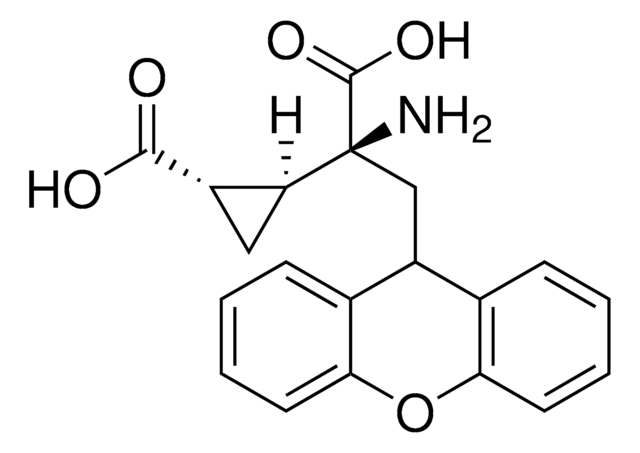 Potent antagonist against group II metabotropic glutamate receptors mGluR2 and mGluR3. LY341495 (LY 341495,LY-341,495, LY-341495) is a group II metabotropic glutamate receptor antagonist that potently reverses 3 μM mGluR agonist ACPD-dependent inhibition of forskolin-induced cAMP production in cells expressing either human mGluR2 ormGluR3 (IC50 = 21 nM and 14 nM, respectively), being much less potent against mGluR8, mGluR7, mGluR1a, mGluR5a, and mGluR4 (IC50 = 0.17, 0.99, 7.8, 8.2, 22μM, respectively). LY341495 is widely used for studying mGluR2/3-dependent cellular and physiological functions both in cultures in vitro and in animals in vivo (1-10 mg/kg via i.p. or s.c.).