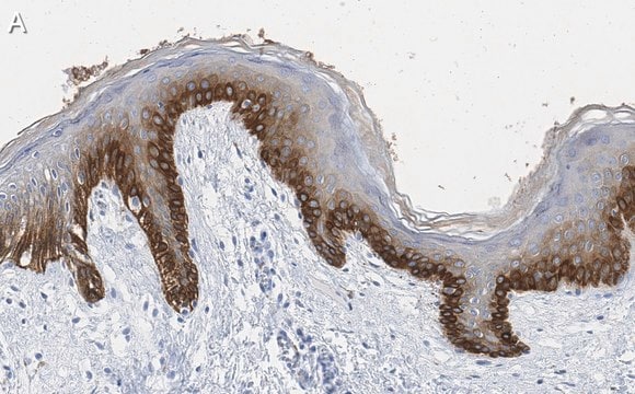 Immunohistochemistry (Paraffin) Analysis: A 1:100 dilution from a representative lot detected pan-cytokeratin in human skin and human urinary bladder tissue sections.