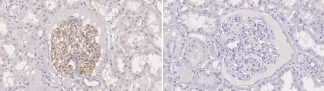 Immunohistochemistry (Paraffin) Analysis: A 1:100 dilution from a representative lot detected ZO-1 in human and rat kidney tissue sections.