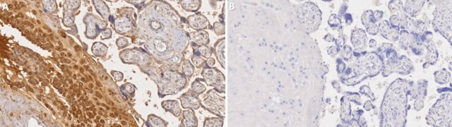 Immunohistochemistry (Paraffin) Analysis: A 1:100 dilution from a representative lot detected TIMP3 in human placenta tissue sections.